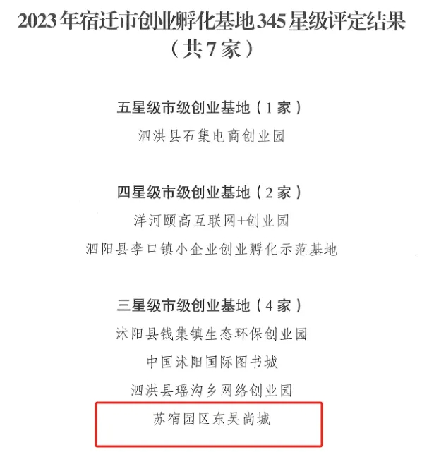 近日,2023年宿遷市創(chuàng)業(yè)孵化基地345星級(jí)評(píng)定結(jié)果發(fā)布,宿遷市蘇宿園區(qū)建設(shè)發(fā)展有限公司服務(wù)項(xiàng)目園區(qū)公舍東吳尚城創(chuàng)業(yè)孵化基地榮獲2023年宿遷市創(chuàng)業(yè)孵化基地三星級(jí)稱號(hào)。
