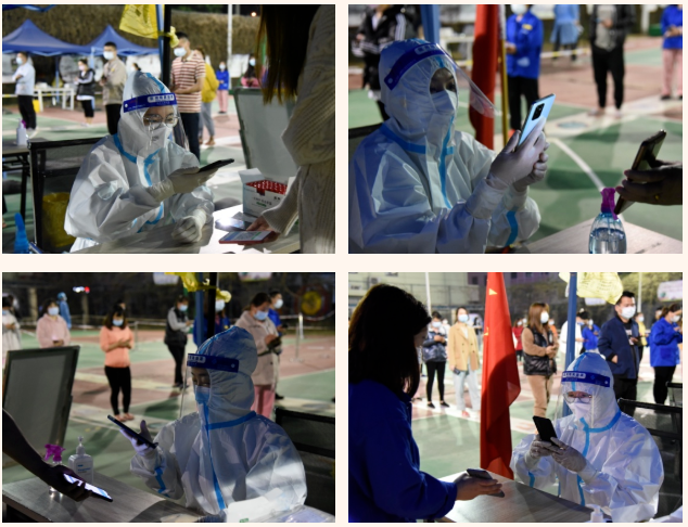 核酸采樣登記是核酸檢測工作中的重要一環(huán)。采樣登記處的“大白”根據(jù)采樣要求,以10人混檢為單位一一完成掃碼登記,仔細核對檢測人員信息。在封控的宿舍內(nèi),“大白”身披改裝挎包,一邊維持著現(xiàn)場秩序,一邊協(xié)助醫(yī)護人員掃碼登記,全力當(dāng)好醫(yī)生“好幫手”。